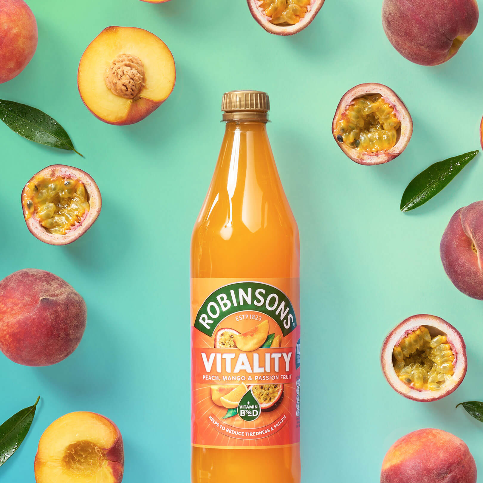 The tasty Robinsons flavour you love, now giving you the Vitality you need. Robinsons Vitality Peach, Mango & Passion Fruit boosted with Vitamins B3 and D which helps to reduce tiredness and fatigue.